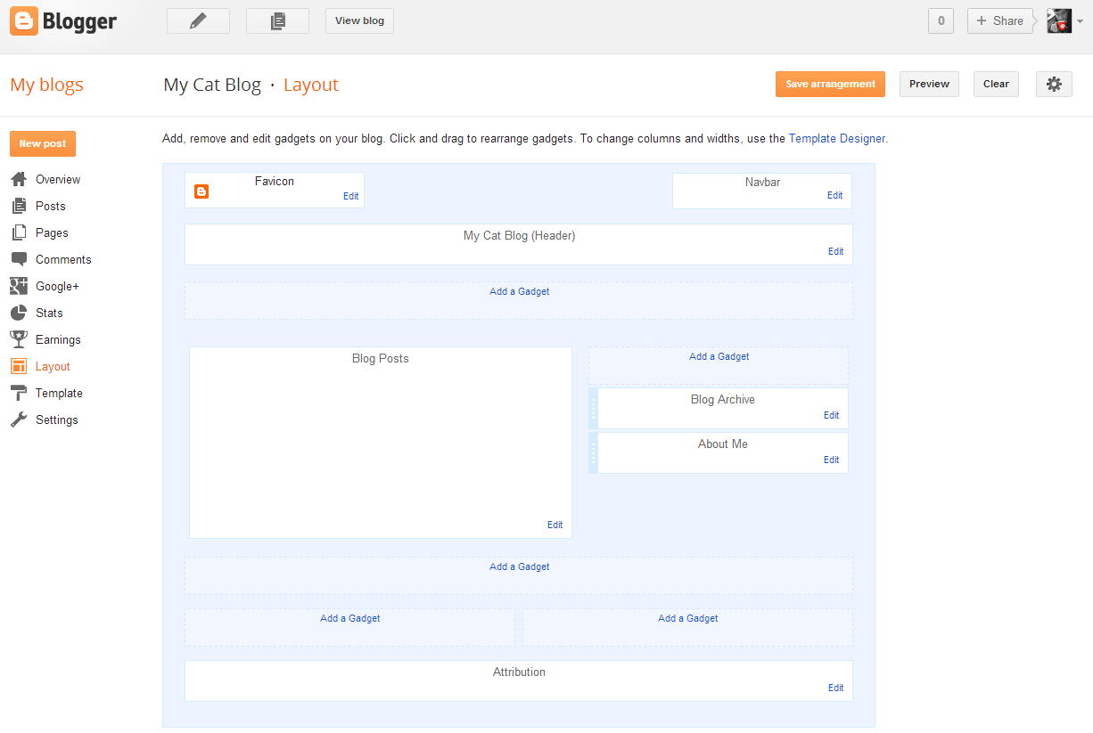 The first thing you need to do is logon to your Blogger Dashboard using your Google account details, then click on the name of your blog. In the screen shot below I would click where it says “My Cat Blog”. Then you need to select “Layout” from the left hand menu.
