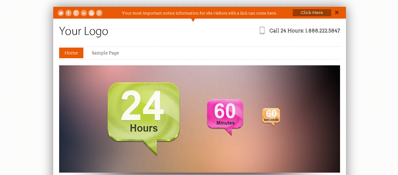 All of the standard features for many free themes are available however, you can obviously add a blog, commenting, pages and of course plugins are all available in the InfoWay WordPress theme. You can also change the header image to anything you like, I also really like the orange “announcement banner” at the top of the page, which cleverly intergrates the social icons to the left.