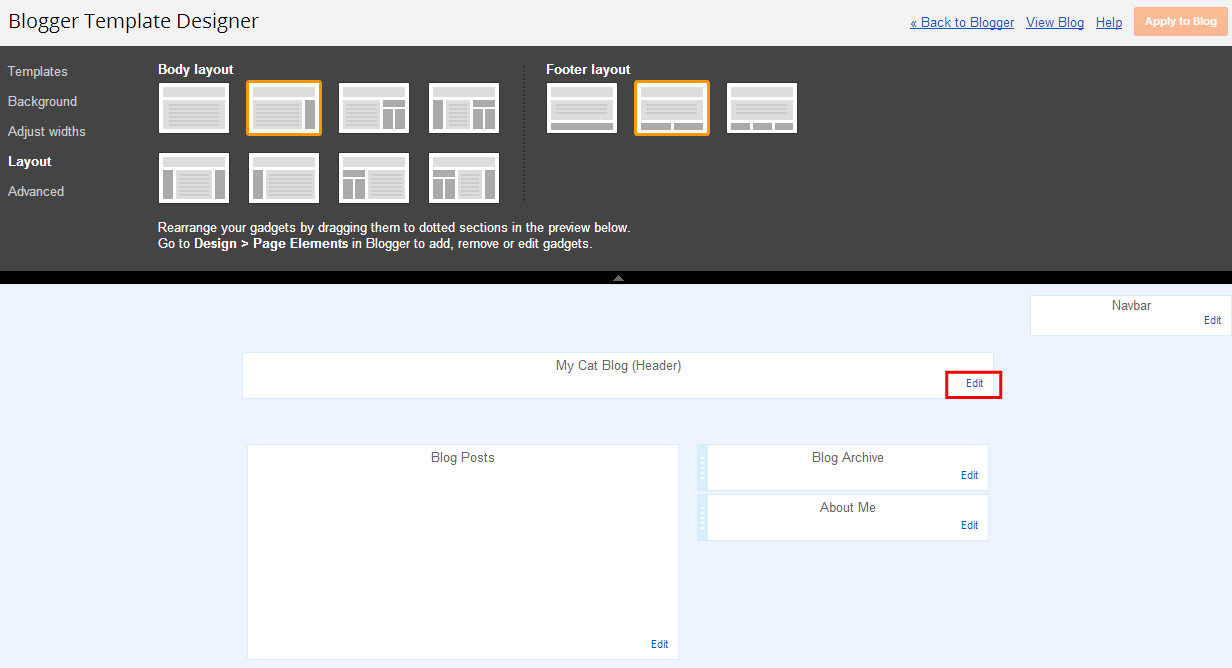 To do this click on the Layout tab on the customisation toolbar. Once you have the layout editor open, click on the Edit link on the header section (highlighted with the Red box below):