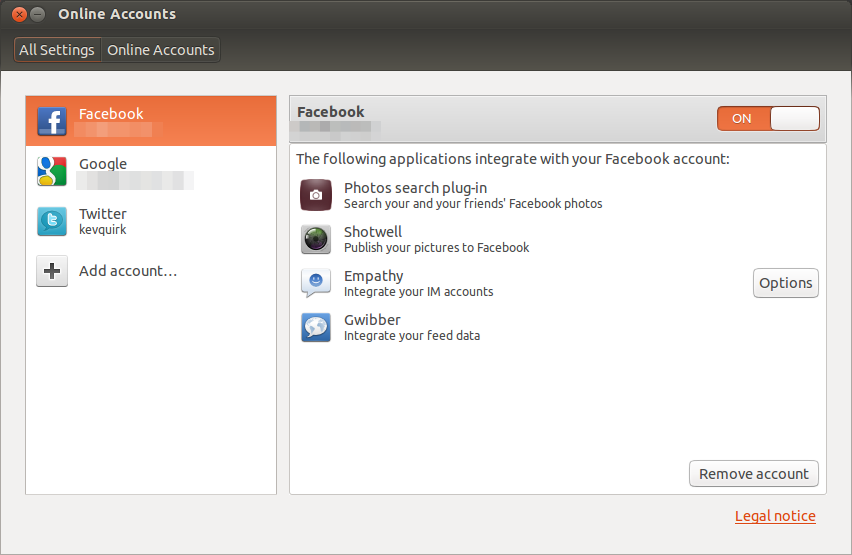 I’ve added my Facebook, Twitter and Google account to the online accounts feature within Ubuntu 12.10 but the only ‘integration’ I can see from doing this is that the social accounts have automatically been added to Gwibber. I really hope this improves with future releases of Ubuntu as I really don’t see the benefit of using the online accounts feature at the moment.