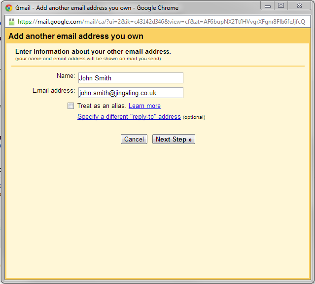 A popup will then appear asking you to enter your new address details, enter your new address and un-tick the Treat as an alias check box. Click next, then next again, leaving all screens on their default values. Gmail will then send a verification code to your new address to prove you own it. Minimise the popup, check your inbox and enter the code to validate your new email address.