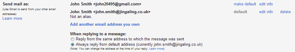 Now that we can receive emails into Gmail from our new email address, we now need to be able to send from our new address. This is where the limitation of Gmail vs Google Apps really shows itself. Once the account is setup so that you can send from your new email address, all emails you send will have the from address as “john20495@gmail.com on behalf of john.smith@jingaling.co.uk“.