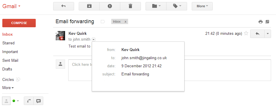 Once the forwarding address is setup all mail sent to john.smith@jingaling.co.uk will automatically be redirected to my Gmail address. You can test this by sending an email to your new address and it should appear in your Gmail inbox.